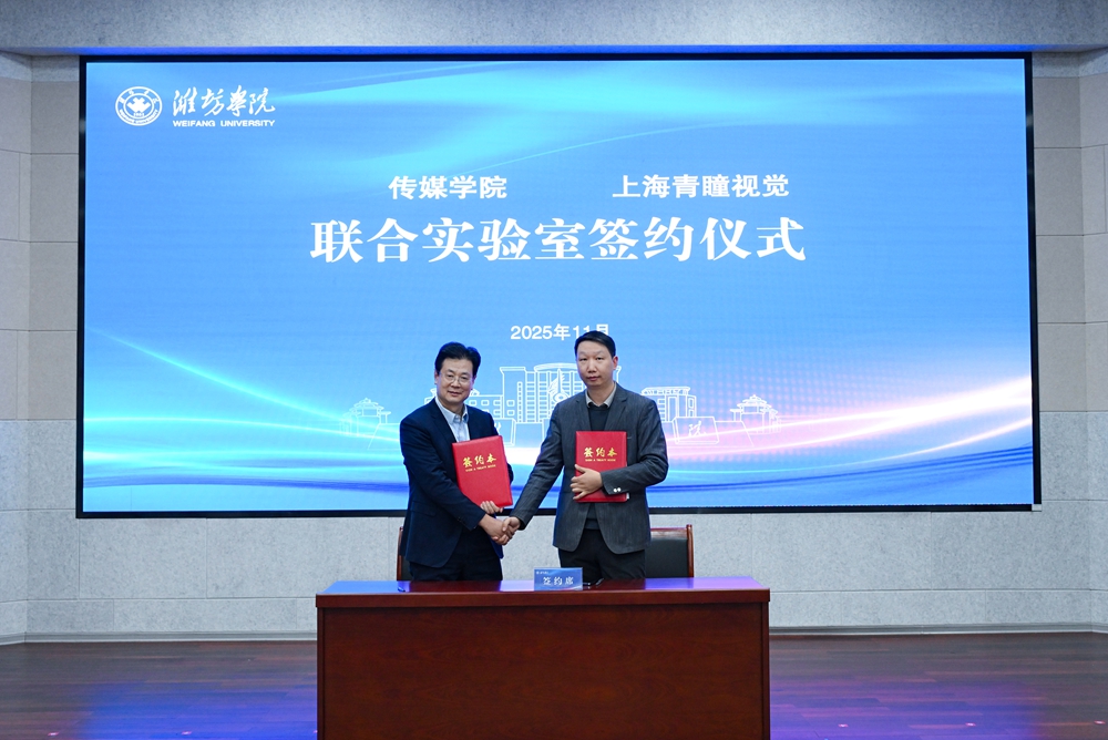 与会领导嘉宾共同启用“潍坊学院数字创意与融媒体协同创新平台”。赵加强为平台指导教师颁发聘书。传媒学院负责同志与上海青瞳视觉有限公司教育事业部总经理许航签订数字表演技术开发联合实验室合作协议,并作表态发言。