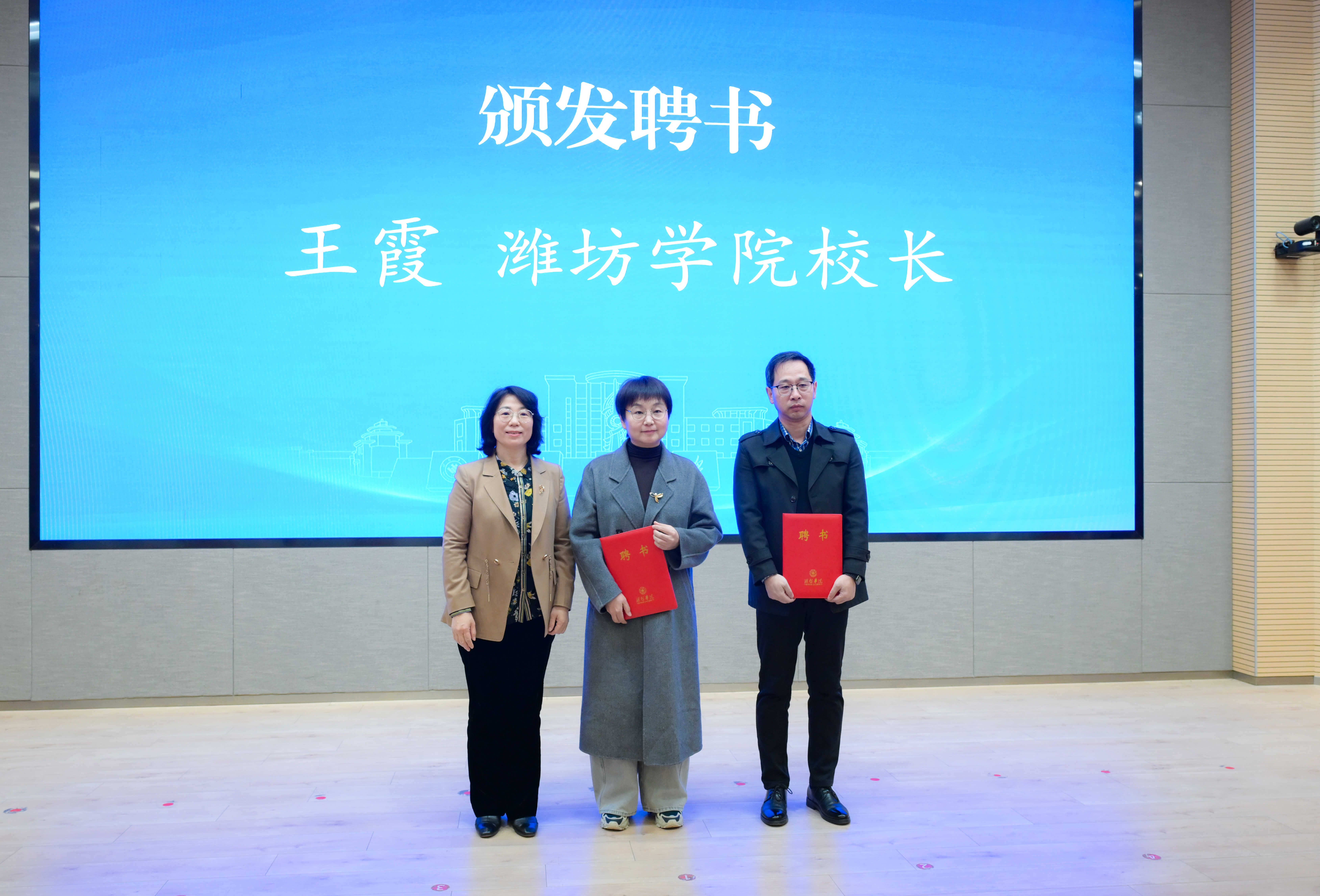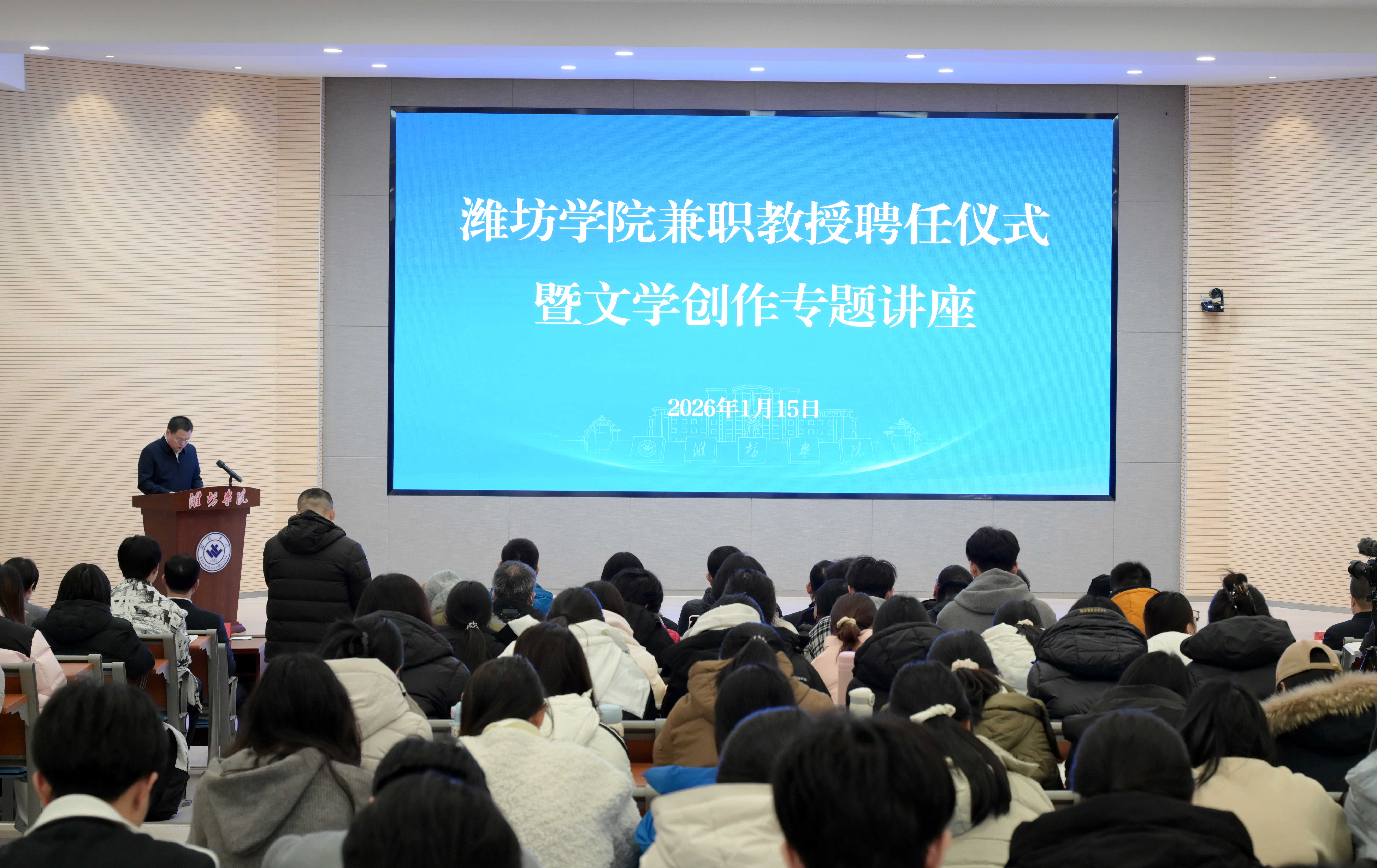 本网讯 1月15日,学校举行兼职教授聘任仪式暨文学创作专题讲座活动。潍坊市委常委、宣传部部长杨建华,学校党委书记来逢波,党委副书记、校长王霞,潍坊市文化和旅游局党组书记、局长高强,潍坊市文学艺术界联合会副主席范德祥,中国作家协会会员、山东省作协全委会委员、潍坊市政协委员王威,中国作家协会会员、山东作协全委会委员、诸城市作家协会主席黄鑫出席活动,学校党委委员、副校长任立春主持活动。