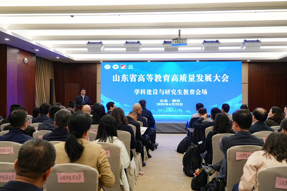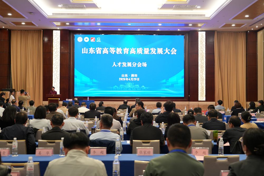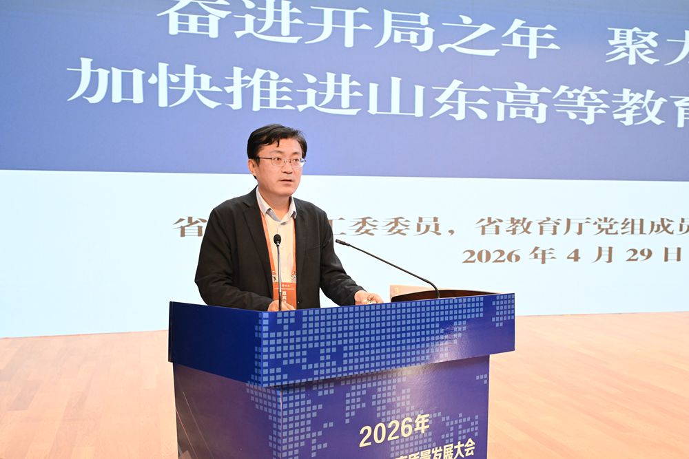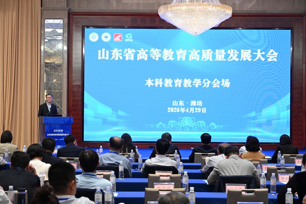 本网讯 4月29日,由山东省高等教育学会主办、潍坊学院承办的“2026年山东省高等教育高质量发展大会”在潍坊召开。省委教育工委委员、省教育厅党组成员、副厅长王浩,潍坊市委书记刘运,中国高教学会教育评估分会副理事长、安徽大学原党委书记蔡敬民,中国教育科学研究院高等教育研究所所长张男星,山东省高等教育学会会长罗公利,副会长冷畅俭、管英俊、曹胜强,学校党委班子成员出席大会。上午主会场分别由山东省高等教育学会副会长刘春华、刘华东,山东省高等教育学会秘书长王霞主持。